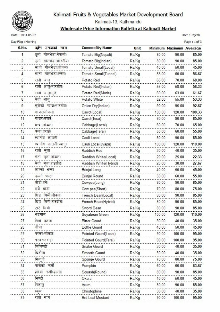 यस्तै सानो गोलभेडा ४५, टनेलको सानो गोलभेडा ५६.६७, रातो आलु ६८, मुढे रातो आलु ६१.६७, सेतो आलु ५३.३३, प्याज ९२.६७, गाजर १०८.३३, बन्दा ५५, स्थानीय काउली ८५, ज्यापु काउली ११०, सेतो मुला २२.३३, लाम्चो भन्टा ४५, तने बोडी ८५, घिउ सिमी ८५ टाटे सिमी ८५, तिते करेला ३५, लौंका ४५, परवर ९५ र चिचिण्डो ३५ रुपैयाँ प्रतिकिलोमा बिक्री भएको छ ।