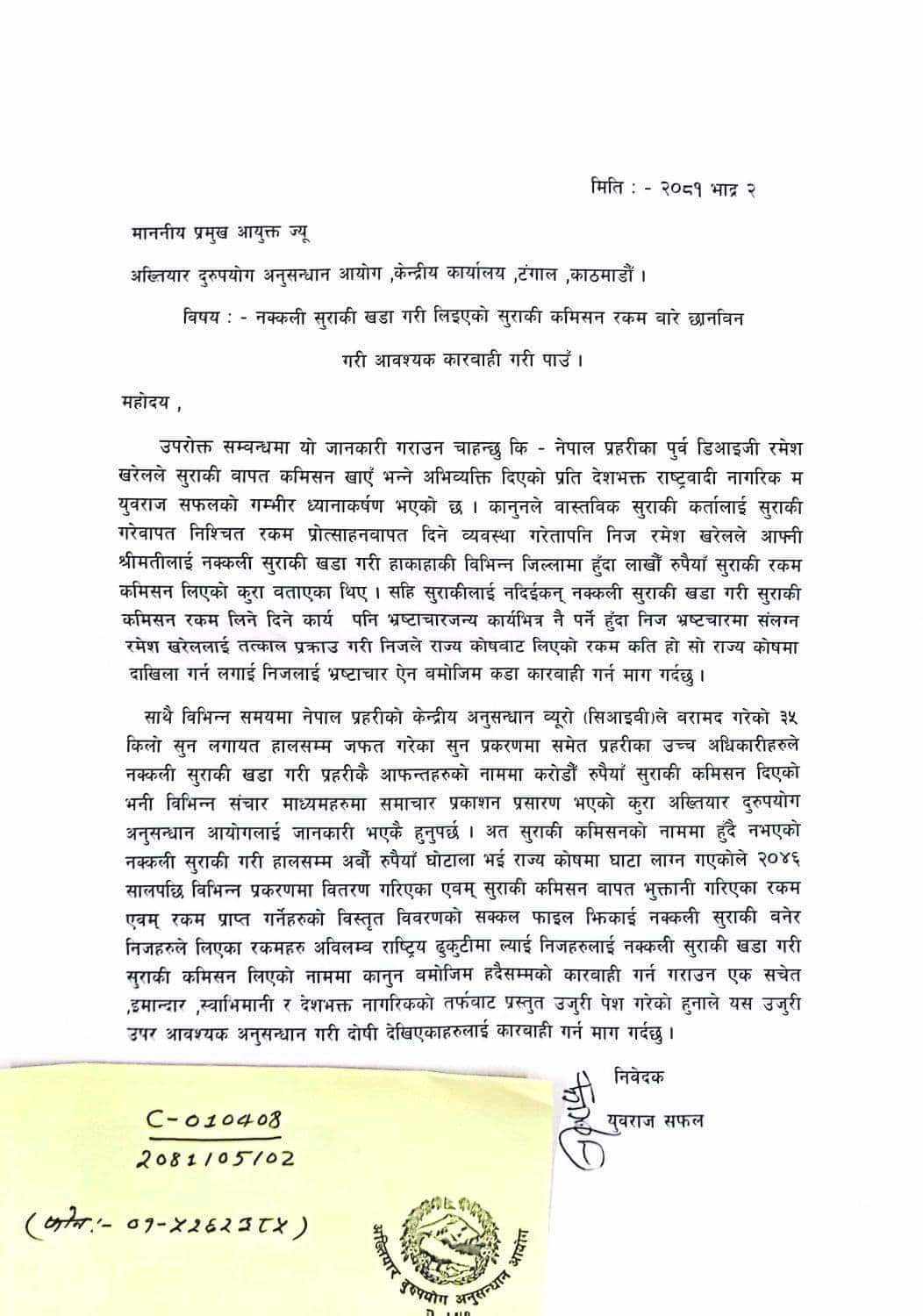 नेपाल प्रहरीका पूर्व डीआईजी रमेश खरेलविरुद्ध अख्तियार दुरुपयोग अनुसन्धान आयोगमा उजुरी दर्ता भएको छ । खरेलविरुद्ध आइतबार सामाजिक अभियन्ता युवराज सफलले उजुरी दर्ता गरेका हुन् ।