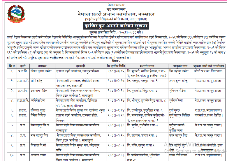 विभिन्न मितिदेखि उनीहरु कार्यालयमा गैरहाजिर रहेको भन्दै प्रहरी प्रधान कार्यालयले ७ दिनभित्र सन्तोषजक स्पष्टीकरणसहित हाजिर हुन आउन मंगलबार सूचना जारी गरेको हो । अन्यथा प्रहरी नियमालीअनुसार सेवाबाट हटाइने सूचनामा उल्लेख छ ।