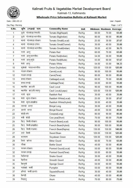 बिहीबार रातो आलुको औसत मूल्य प्रतिकेजी ६५ रुपैयाँ रहेको छ । प्याज सुकेको १२५ रुपैयाँ, लोकल गाजर ९५ रुपैयाँ, सेतो मूला हाइब्रीड ३५ रुपैयाँ प्रति केजी रहेको छ ।स्थानीय काउली ९५ रुपैयाँ, बन्दा लोकल ६५ रुपैयाँ, लौका ४५ रुपैयाँ, भिण्डी ४५ रुपैयाँ र ठूलो नेपाली गोलभेँडा ६५ रुपैयाँ प्रति केजी तोकिएको छ ।