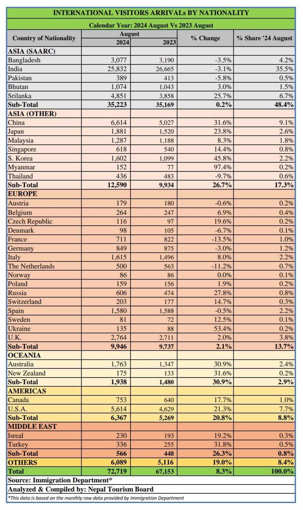 यससँगै सन् २०२४ को ८ महिनामा सो संख्यामा पर्यटक आएको तथ्यांकले देखाएको छ । मार्च महिनामा सबैभन्दा धेरै १ लाख २८ हजार १६७ जना पर्यटक आएको नेपाल पर्यटन बोर्डले जनाएको छ । जुलाईमा सबैभन्दा कम ६४ हजार ५९९ पर्यटक आएको बोर्डको तथ्यांकमा देखिन्छ । भारतबाट २५ हजार ८३२, चीनबाट ६ हजार ६१४, अमेरिकाबाट ५ हजार ६१४, श्रीलंका ४ हजार ८५१ र बंगलादेशबाट ३ हजार ७७ जना पर्यटक भित्रिएका छन् ।