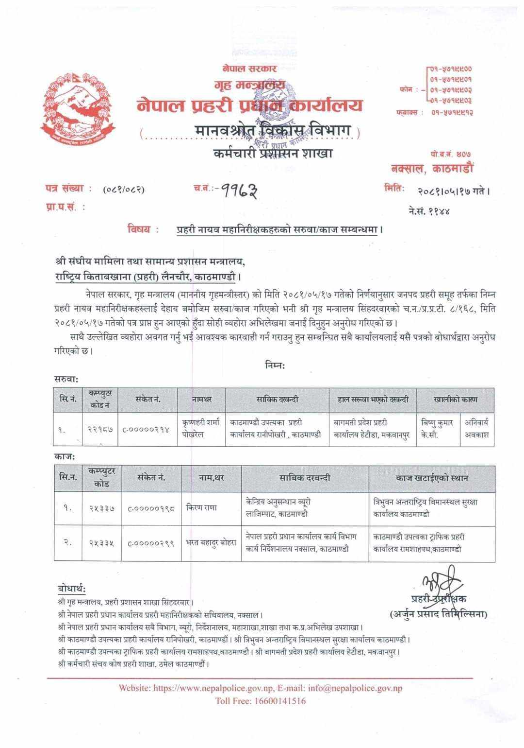 यस्तै, त्रिभुवन अन्तर्राष्ट्रिय विमानस्थल सुरक्षा कार्यालयमा किरण राणा र उपत्यका ट्राफिक प्रहरी कार्यालयमा भरतबहादुर बोहरालाई काज सरुवा गरिएको छ । विमानस्थल र उपत्यका ट्राफिकमा पनि केही समयदेखि डीआइजी थिएनन्, भने डीआइजी विष्णु केसी ३० वर्षे सेवा अवधिका कारण अवकाशमा भएपछि बागमती प्रदेशमा डीआइजीको पद रिक्त थियो ।