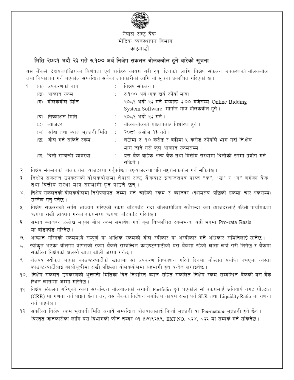 राष्ट्र बैंकका अनुसार यो रकमको साँवा तथा ब्याज भुक्तानी असोज १३ गते गरिनेछ । बैंकहरूमा अहिले ७ खर्बभन्दा बढी रकम कर्जा लगानीका लागि रहेकाले रकम सङ्कलन गर्न लागिएको राष्ट्र बैंकले जनाएको छ । कर्जाको माग नभएपछि बजारको सन्तुलन कायम गर्न राष्ट्र बैंकले बेलाबेला निक्षेप सङ्कलन गर्दै आएको छ ।