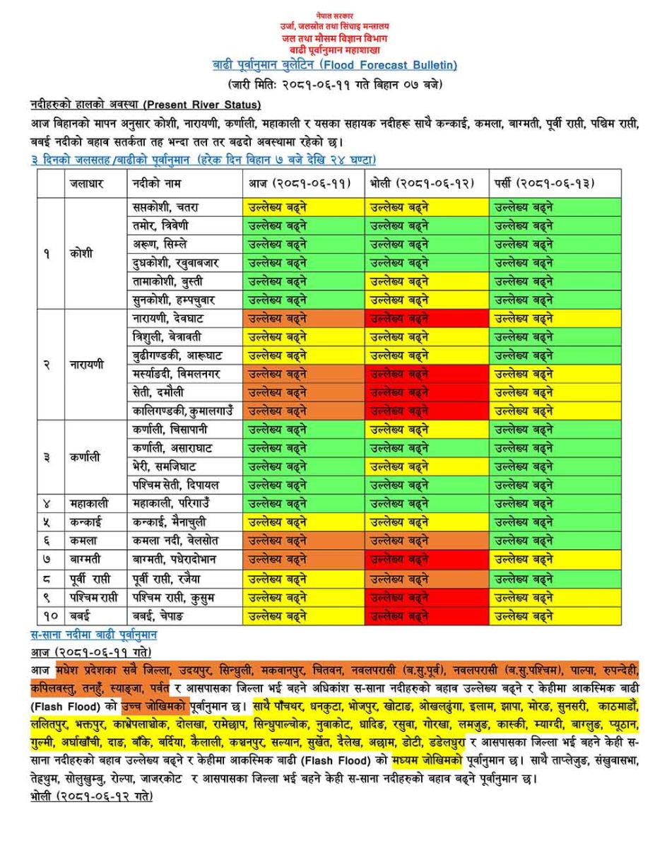 महाशाखाले मध्यम, उच्च र अति उच्च जोखिमपूर्ण नदीहरूको सूची सार्वजनिक गर्दै आगामी तीन दिन मौसम बदली भई ठाउँठाउँमा भारी र उच्च भारी वर्षा हुने भएकाले नदीहरुको जल सतह बढ्न सक्ने जानकारी दिएको छ । असोज ११ गते नारायणी नदीमा उच्च जोखिम र १२ गते अति उच्च जोखिम रहने विभागको अनुमान छ । यस्तै कन्काई नदी ११ गते उच्च जोखिम हुने र अरु समयमा मध्यम जोखिम हुने जनाइएको छ ।