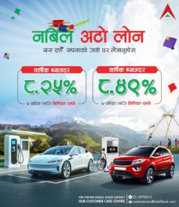 बैंकले भनेको छ – नबिल अटो लोनका साथ यस दशैँमा आफ्नो सपनाको गाडी घर भित्र्याउनुहोस्। बैंकले अटो लोनमा ५ वर्षका लागि वार्षिक ८.२५ प्रतिशत र ७ वर्षका लागि ८.४९ प्रतिशत ब्याजदर उपलब्ध गराउने जनाएको छ ।