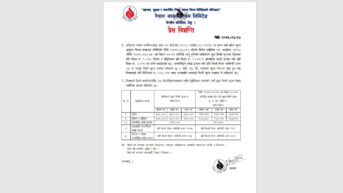 यो मूल्य सोमबार मध्यराति १२ बजेदेखि लागू हुनेछ ।