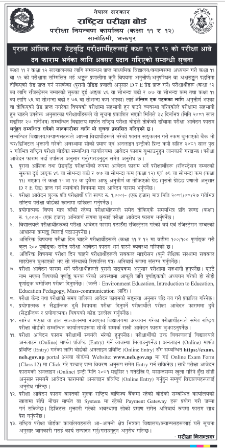 पुराना आंशिक तथा ग्रेडवृद्धि परीक्षार्थीहरुले कक्षा ११ र १२ को परीक्षा आवेदन फाराम ३५ दिनभित्र भर्न पाउने भएका छन्। राष्ट्रिय परीक्षा बोर्ड, परीक्षा नियन्त्रण कार्यालय (कक्षा ११ र १२) ले सार्वजनिक सूचना निकालेर मंसिर ७ गतेभित्र आवेदन फारम भर्न सकिने उल्लेख गरेको छ।