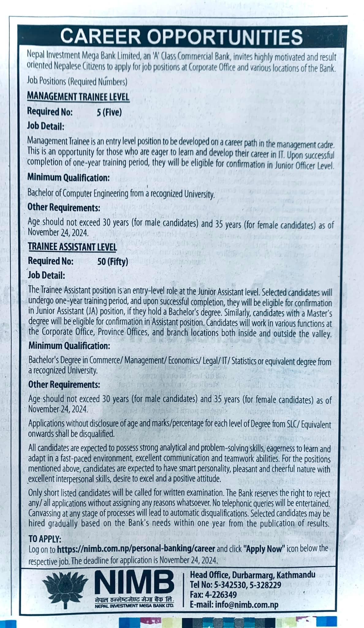 उक्त पदहरुमा आवेदन दिन इच्छुक नागरिकले बैंकको आधिकारीक वेबसाइट https://www.nimb.com.np/personal-banking/career/ta मार्फत आवेदन दिन सक्नेछन्।