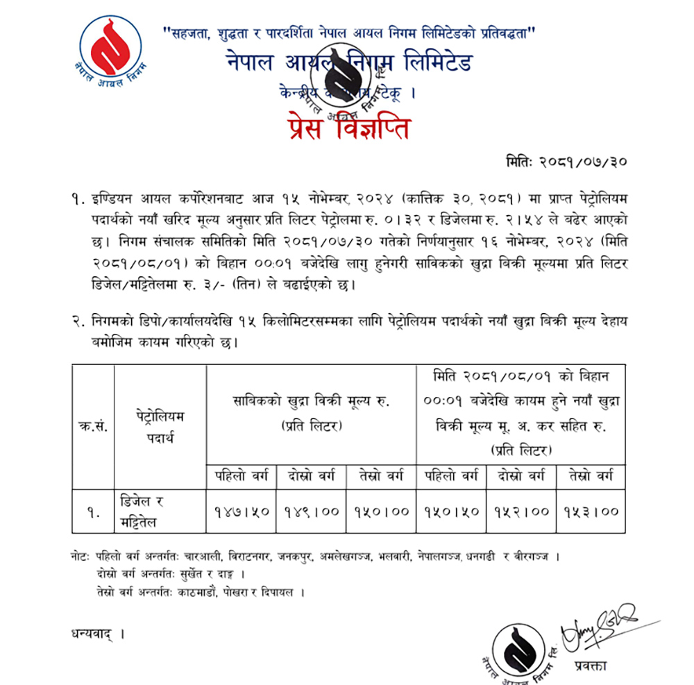निगमले बढेको मुल्य आज राति १२ बजेदेखि लागि हुने निगमले जनाएको छ। नयाँ मुल्य अनुसार अब काठमाडौँमा डिजल तथा मट्टीतेलको प्रति लिटर १५३ रुपैयाँ पर्ने भएको छ।