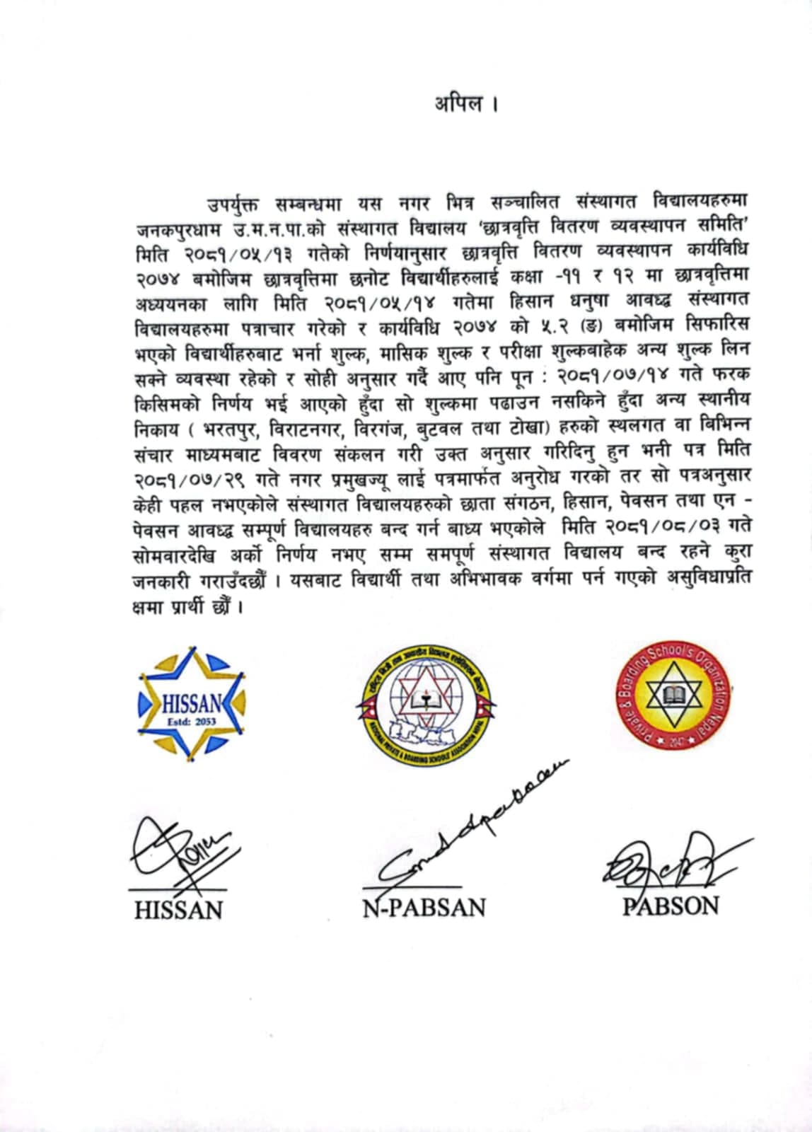 छात्रवृत्तिमा अध्ययनको शुल्को विषयलाई हिसान, प्याब्सन र एनप्याब्सनले संयुक्तरुपमा आजदेखि अनिश्चितकालीन शैक्षिक संस्था बन्दको आह्वान गरेको हो। संस्थागत विद्यालयको कक्षा ११ र १२ मा छात्रवृत्तिमा अध्ययनरत विद्यार्थीको अन्य शुल्कको विषयमा जनकपुरधाम उपमहानगरपालिका १४ कात्तिकमा गरेको निर्णय फिर्ता हुनुपर्ने संगठनहरुको माग छ।