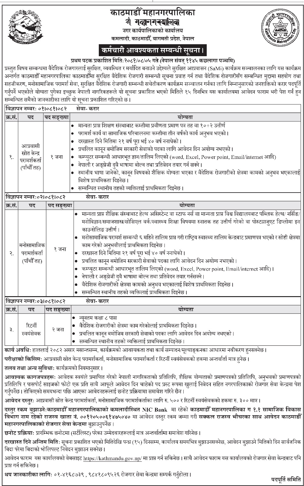 काठमाडौँ महानगरपालिकाले विभिन्न पदका लागि कर्मचारी मागेको छ।