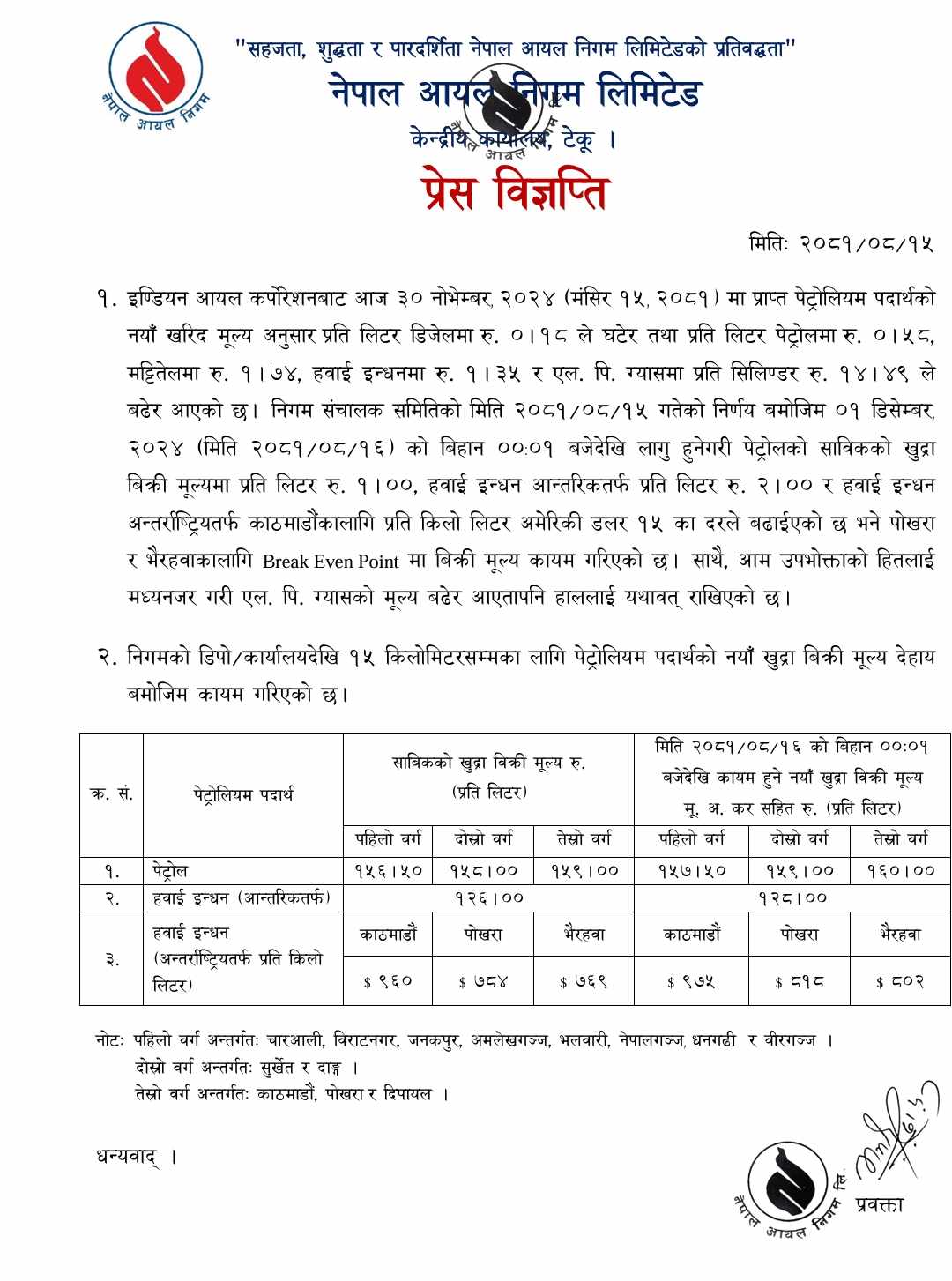त्यस्तै, हवाई इन्धनको मूल्य पनि बढेर आएको निगमले विज्ञप्तिमार्फत जानकारी गराएको छ। आन्तरिकतर्फ २ रुपैयाँ र अन्तर्राष्ट्रियतर्फ काठमाडौंका लागि प्रति किलोलिटर १५ डलरले मूल्यवृद्धि भएको निगमले जनाएको छ। खाना पकाउने ग्यासको भने मूल्य यथावत् रहेको निगमतले जारी गरेको विज्ञप्तिमा जनाइएको छ। उपभोक्ताको हितलाई मध्यनजर गर्दै ग्यासको मूल्य बढेर आएपनि अहिलेलाई यथावत् राखिएको निगमले बताएको छ।