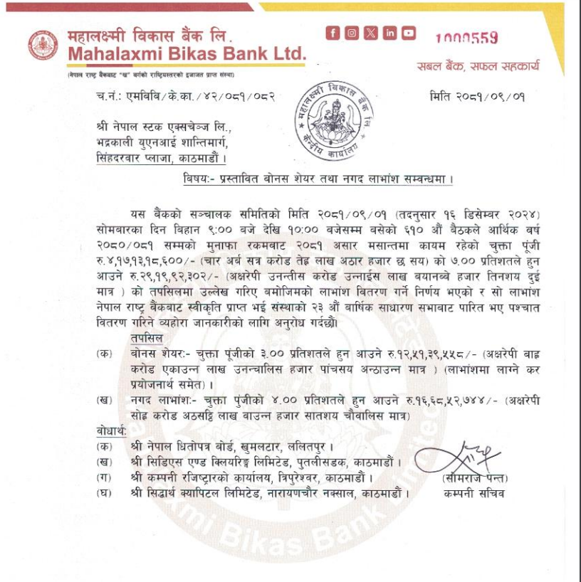 महालक्ष्मी विकास बैंकले शेयरधनीलाई लाभांश दिने प्रस्ताव गरेको छ।