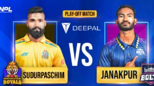 नेपाल प्रिमियर लिग |(एनपीएल)को फाइनल प्रवेशका लागि आज सुदूरपश्चिम रोयल्स र जनकपुर बोल्ट्सबीच खेल हुँदैछ। कीर्तिपुरस्थित त्रिवि क्रिकेट मैदानमा हुने खेल दिउँसो १ बजेदेखि सुरु हुनेछ।