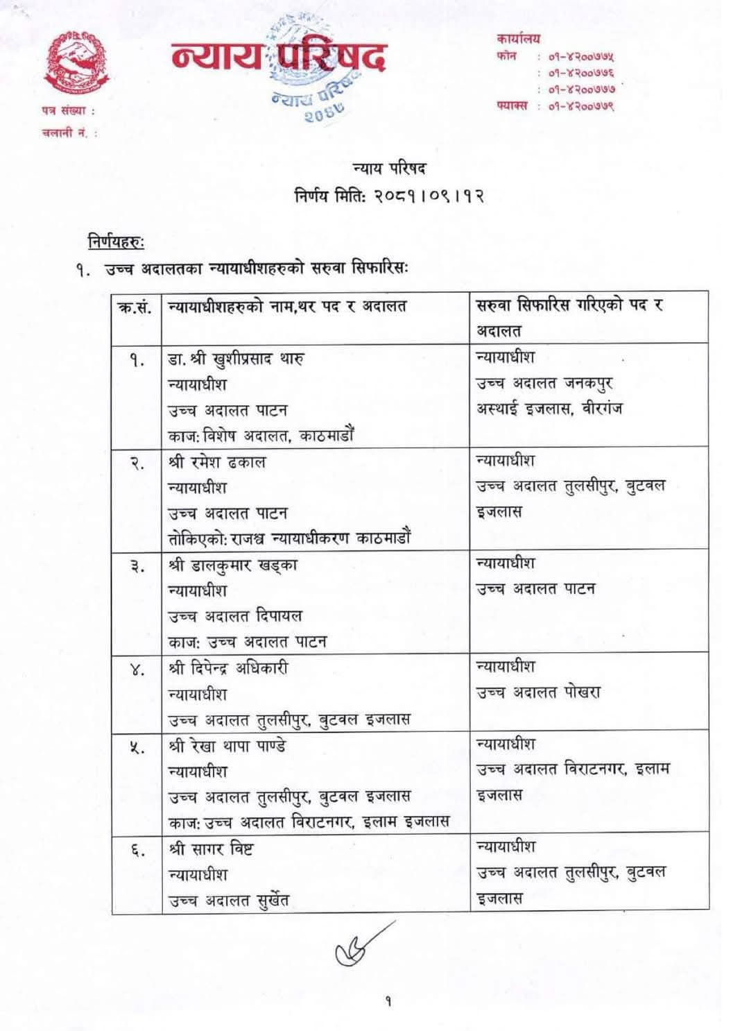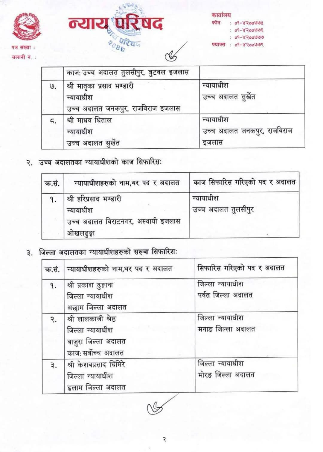 न्याय परिषदले उच्च अदालत र जिल्ला अदालतका न्यायाधीशहरुको सरुवाका लागि सिफारिस गरेको छ।