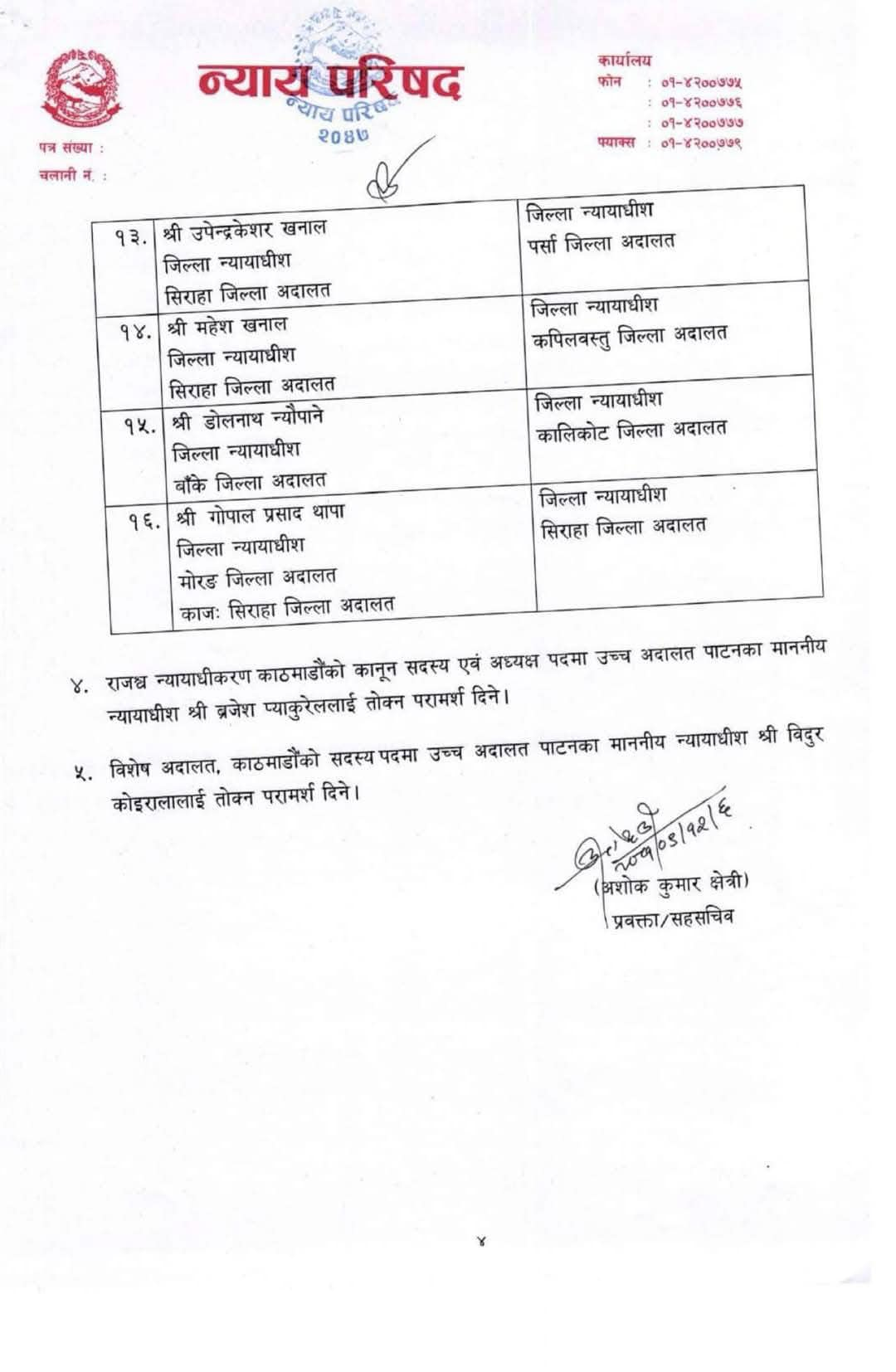 शुक्रबार बसेको बैठकले उच्च अदालतका ९ जना र जिल्ला अदालतका १६ जना न्यायाधीशको सरुवाको लागि सिफारिस गरेको हो। उच्च अदालत पाटन दरबन्दी भई विशेष अदालतमा काजमा खटाइएका खुशीप्रसाद थारुको उच्च अदालत जनकपुरको अस्थाई इजलास वीरगन्जमा सरुवा सिफारिस भएको छ।