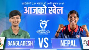 यस विश्वकपमा पहिलोपटक सहभागी हुन लागेको नेपालको महिला टोलीले बंगलादेशसँग खेल्दै प्रतियोगिताको सुरूवात गर्ने छ। नेपाल र बंगलादेशबीचको खेल मलेसियाको बाङ्गीस्थित यूकेएम क्रिकेट ओभलमा शनिबार दिउँसो नेपाली समयअनुसार सवा १२ बजेदेखि खेल सुरू हुनेछ। नेपालको कप्तानमा पुजा महतो तथा बंगलादेशको कप्तानमा सुमैया अक्तर छन्।