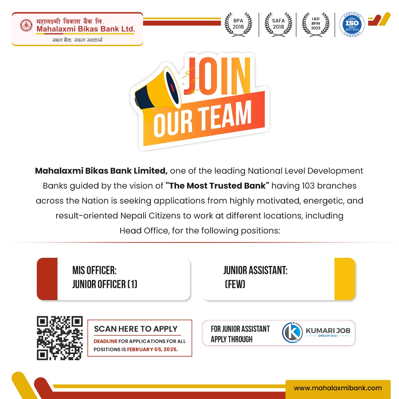महालक्ष्मी विकास बैंकमा रोजगारीको अवसर खुलेको छ।