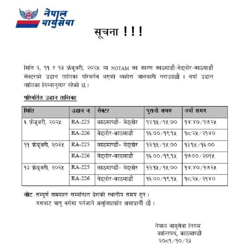 नेपाल एयरलाइन्सले तीन दिनका लागि बेङ्लोर उडान तालिका परिवर्तन भएको छ।