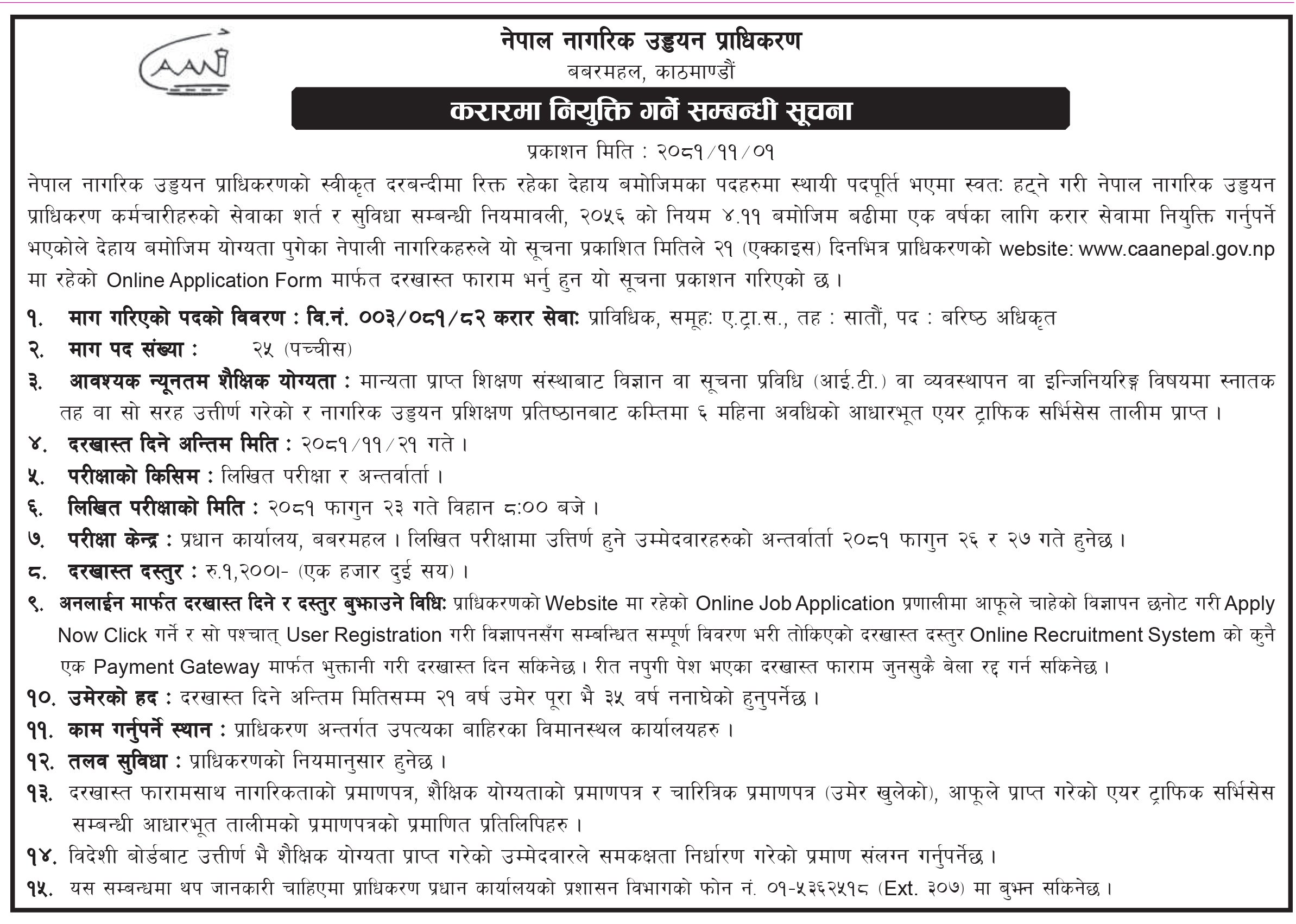 स्थायी पदपूर्ति भएमा स्वतः हट्ने गरी नेपाल नागरिक उड्डयन प्राधिकरण कर्मचारीहरूको सेवाका सर्त र सुविधा सम्बन्धी नियमावली, २०५६ को नियम ४. ११ बमोजिम बढीमा एक वर्षका लागि करार सेवामा नियुक्ति गरिने प्राधिकरणले जनाएको छ। योग्यता पुगेका नेपाली नागरिकहरूले सूचना प्रकाशित मितिले २१ (एक्काइस) दिनभित्र दरखास्त फाराम भर्न सूचनामा उल्लेख गरिएको छ।
