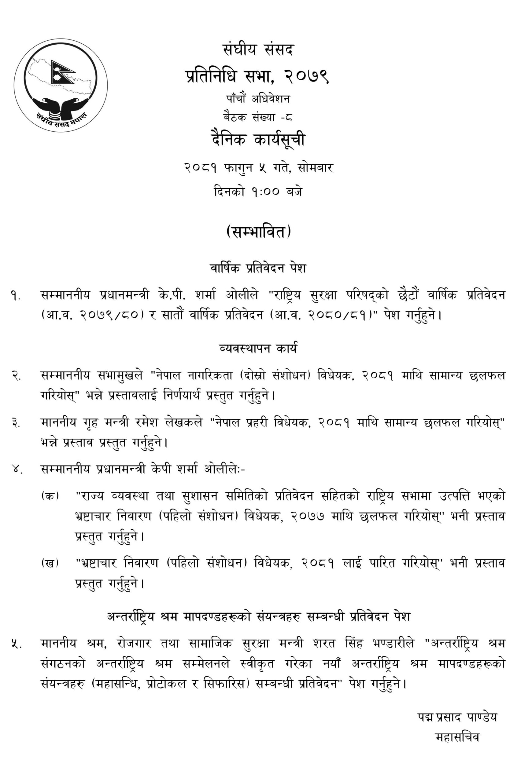 दिउँसो १ बजे बस्ने बैठकमा नेपाल नागरिकता (दोश्रो संशोधन) विधेयक, २०८१ माथि छलफल हुनेछ। यसैगरी आजको बैठकमा भ्रष्टाचार निवारण पहिलो संशोधन विधेयकबारे छलफल गर्ने र पारित गर्ने कार्यसूची छ। संघीय संसदको सचिवालयले आजको सम्भावित कार्यसूचीमा नेपाल प्रहरी विधेयक २०८१ माथि पनि छलफल हुनेछ।