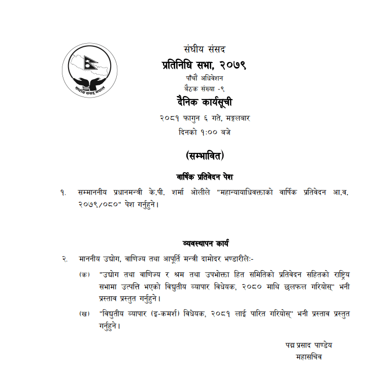 विद्युतीय व्यापार (इ–कमर्स) विधेयक, २०८१ पारित गर्न मन्त्री मन्त्री भण्डारीले प्रस्ताव गर्ने संसद् सचिवालयले जनाएको छ।