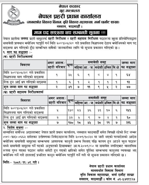 यसअघि मिति २०८१/०५/२८ गते प्रकाशित विज्ञापनमा तोकिएको संख्यामा संशोधन गर्दै थप माग गरिएको नेपाल प्रहरीले जनाएको छ। प्रहरी निरीक्षकका लागि ६४ जनाको माग गरिएकोमा थप १३ पद थप गरी कुल ७७ जनाका लागि अवसर खुला गरिएको छ। त्यसैगरी, प्रहरी सहायक निरीक्षक पदमा २५६ जनाको माग गरिएकोमा ६० जना थप गरी कुल ३१६ पद खुला गरिएको छ।