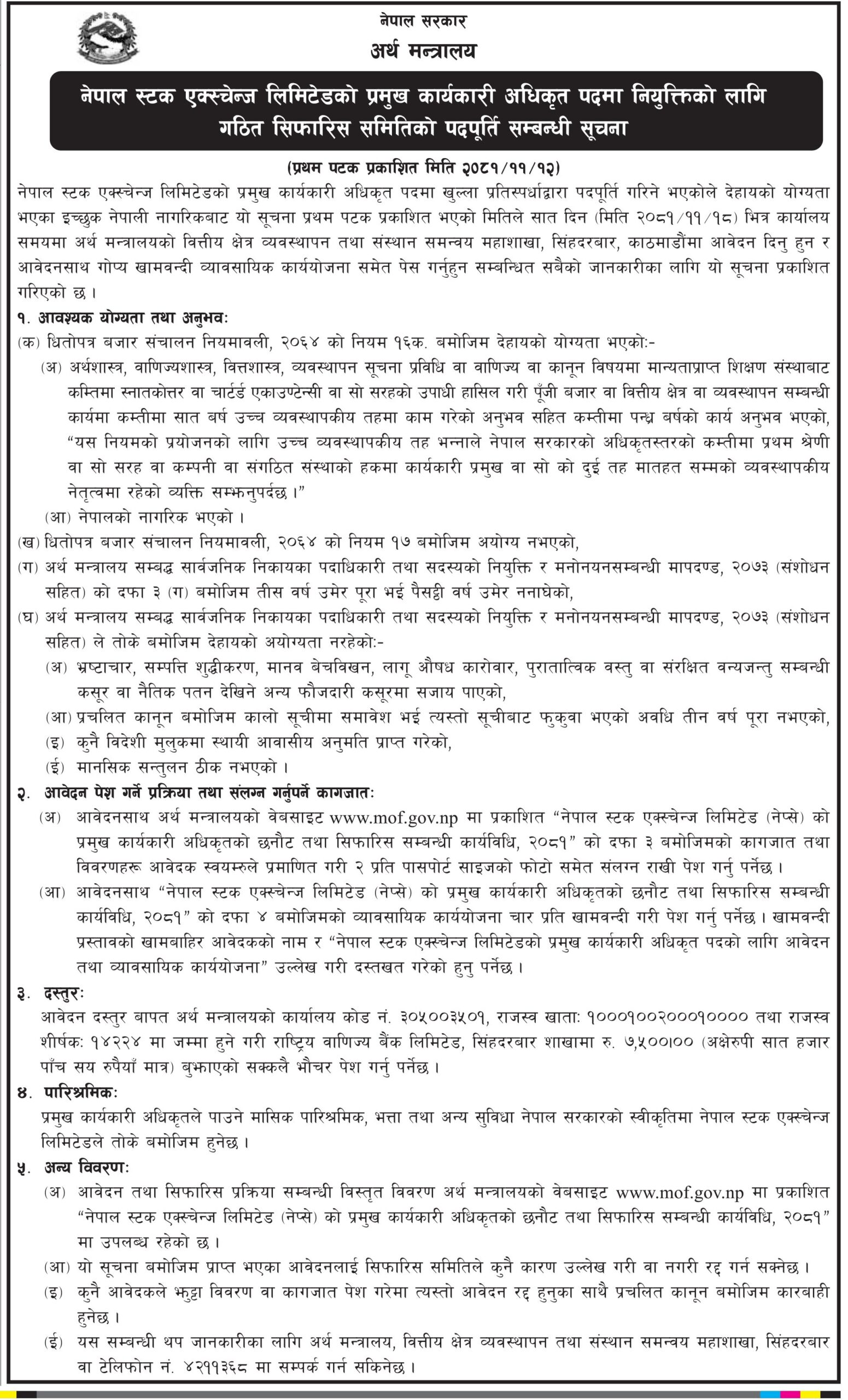अर्थ मन्त्रालयले नेपाल स्टक एक्सचेन्ज लिमिटेडको प्रमुख कार्यकारी अधिकृत पदमा नियुक्तिको लागि दरखास्त आह्वान गरेको छ।
