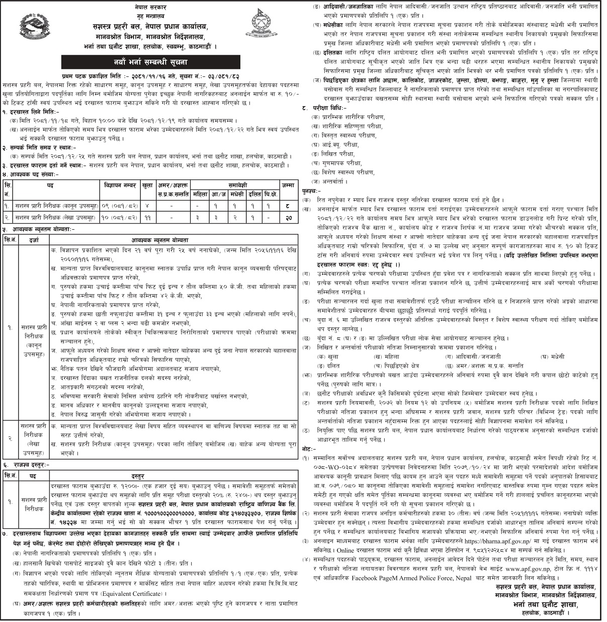 सशस्त्र प्रहरी बल, नेपालको प्रधान कार्यालयले फागुन १८ गतेदेखि चैत १९ गतेसम्म दरखास्त दिन सक्ने व्यवस्था मिलाएको छ । अनलाइनमार्फत दरखास्त दिए पनि चैत २२ गतेसम्म भौतिक रुपमै उपस्थित भएर सक्कलै दरखास्त बुझाउनुपर्ने छ ।उम्मेदवारहरुले प्रत्येक चरणको परीक्षामा उपस्थित हुँदा प्रवेश पत्र र नागरिकताको सक्कल प्रति साथमा लिएको हुनु पर्नेछ । प्रत्येक चरणको परीक्षा समाप्ति पश्चात नतिजा प्रकाशन हुने छ, उत्तीर्ण उम्मेदवारहरुलाई मात्र अर्को चरणको परीक्ष सम्मिलित हुन पाउने छन् ।