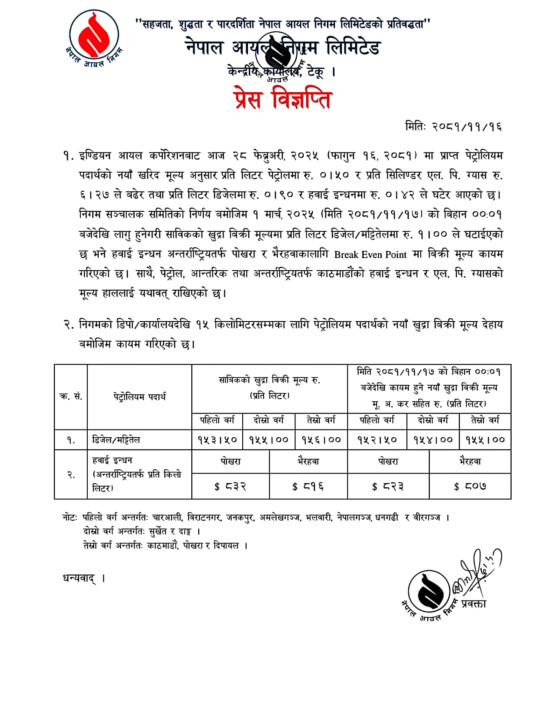पेट्रोलको मूल्य भने यथावत् राखिएकाे छ ।