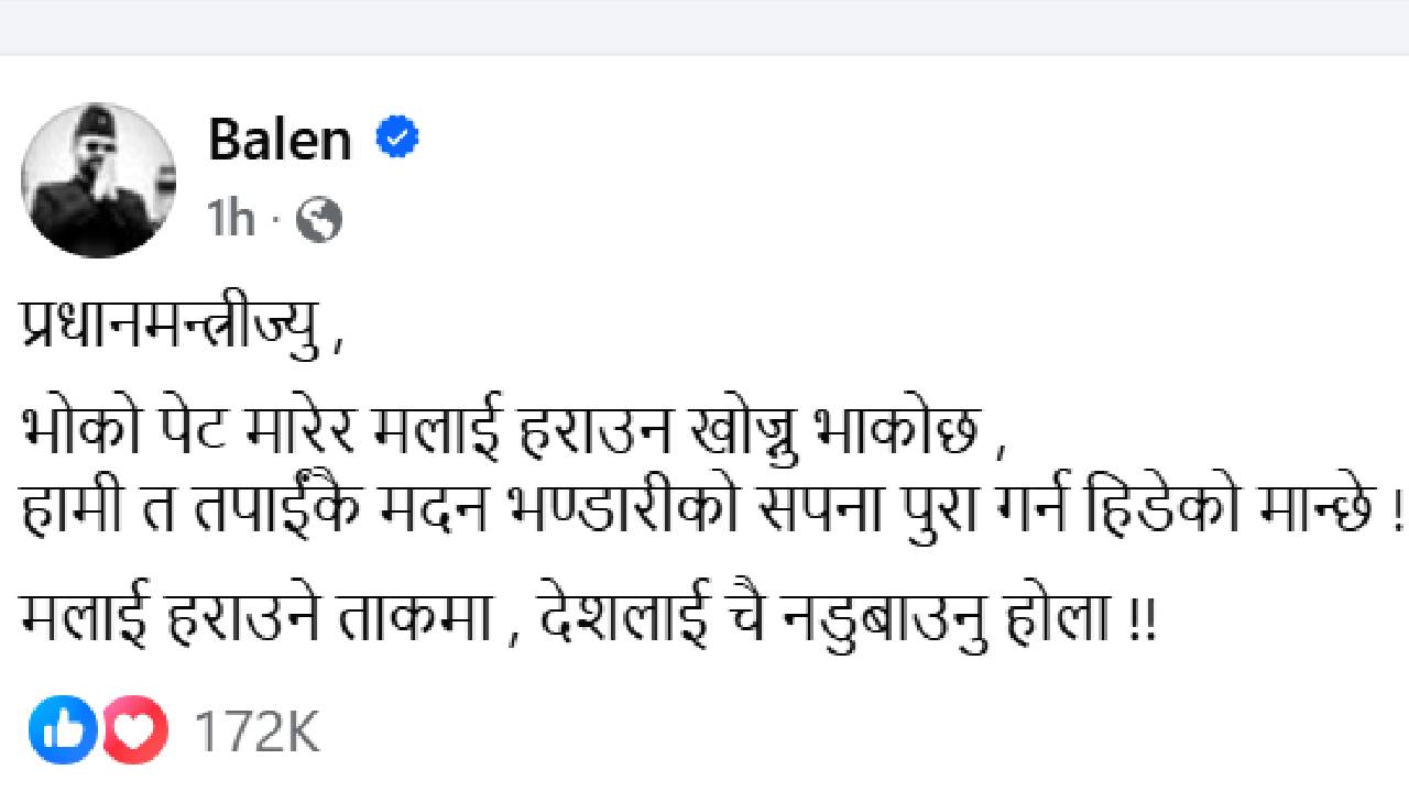 महानगरमा प्रमुख प्रशासकीय अधिकृत नपठाएको सन्दर्भमा बालेनले शुक्रबार फेसबुकमा लेख्दै यस्तो बताएका हुन्। ‘हामी त तपाईंकै मदन भण्डारीको सपना पूरा गर्न हिँडेको मान्छे,’ उनले लेखेका छन्, ‘मलाई हराउने ताकमा, देशलाई चाहिँ नडुबाउनु होला।’