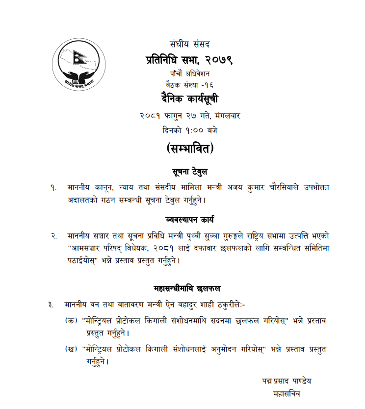 आजको बैठकमा सो संशोधनमाथि छलफल पनि हुने सचिवालयले जनाएको छ। वनमन्त्री ठकुरीले ‘मोन्ट्रियल प्रोटोकल किगाली संशोधनलाई अनुमोदन गरियोस्’ भन्ने प्रस्ताव पनि सभासमक्ष प्रस्तुत गर्ने कार्यसूचीमा उल्लेख छ।