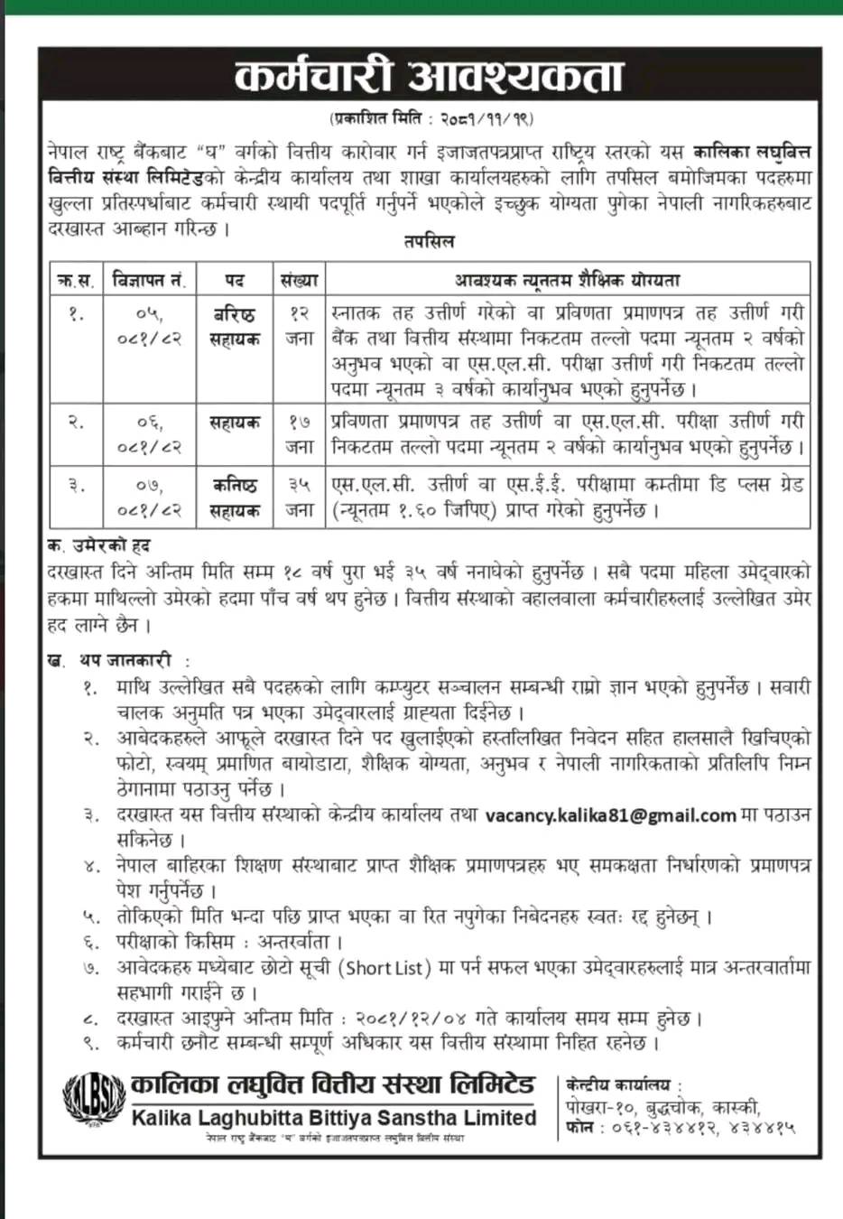 कालिका लघुवित्त वित्तीय संस्थाले माग गरेको कर्मचारीको लागि आवेदन दिने आज अन्तिम दिन रहेको छ।