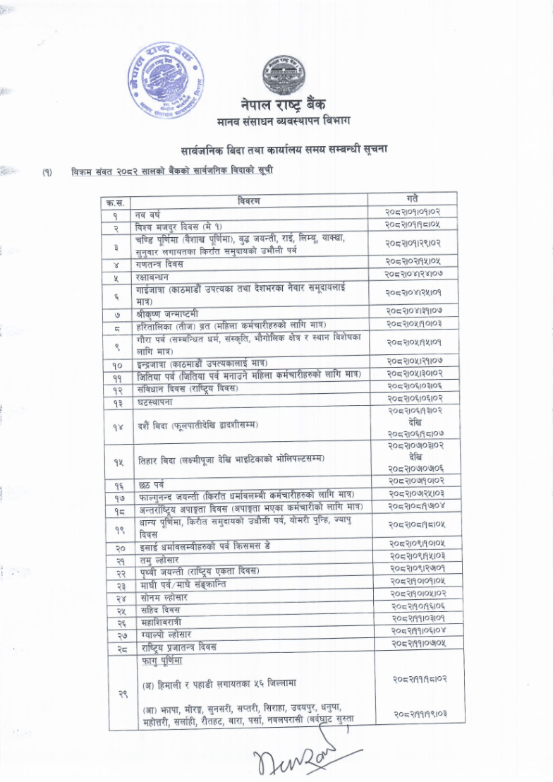 बैंक तथा वित्तीय संस्थाहरूको २०८२ का लागि बिदा सूची सार्वजनिक (सूचीसहित)