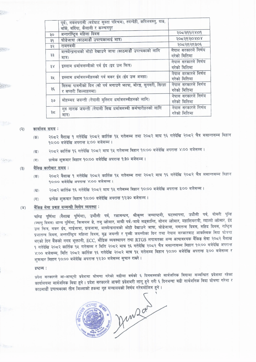 नेपाल राष्ट्र बैंकले आगामी वर्षका लागि बैंकिङ र कार्यालय समय पनि निर्धारण गरेको छ। २०८२ वैशाख १ गतेदेखि कात्तिक १५ गतेसम्म र माघ १६ गतेदेखि चैत मसान्तसम्म कार्यालय समय बिहान १० बजे देखि अपराह्न ५ बजे सम्म हुनेछ। कात्तिक १६ गतेदेखि माघ १५ गतेसम्म भने कार्यालय समय बिहान १० बजे देखि अपराह्न ४ बजे सम्म रहनेछ। प्रत्येक शुक्रवार कार्यालय समय बिहान १० बजे देखि १:३० बजेसम्म हुनेछ।