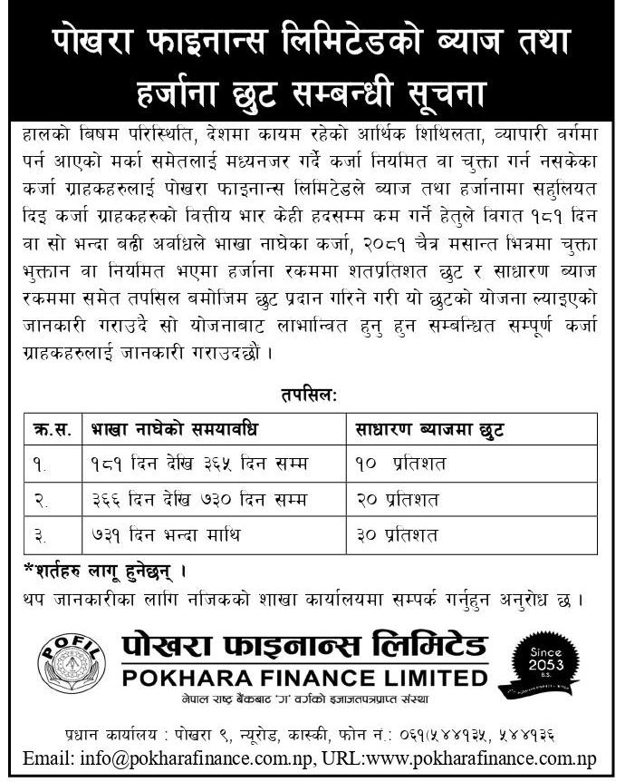 हालको आर्थिक शिथिलता र व्यापारिक क्षेत्रमा देखिएको मन्दीलाई मध्यनजर गर्दै पोखरा फाइनान्स लिमिटेडले कर्जा नियमित वा चुक्ता गर्न नसकेका ग्राहकहरूलाई राहत दिने उद्देश्यले विशेष छुट योजना सार्वजनिक गरेको छ।