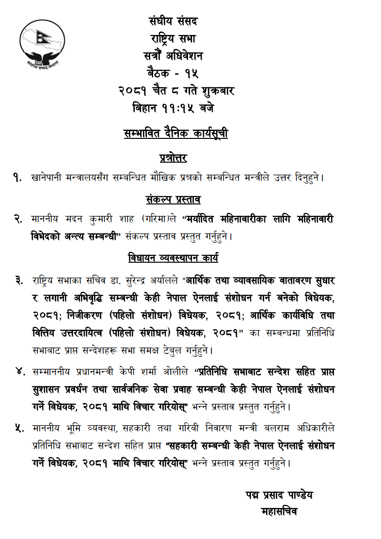 यस्तै, राष्ट्रियसभा सदस्य मदनकुमारी शाहले ‘मर्यादित महिनावारीका लागि महिनावारी विभेदको अन्त्यसम्बन्धी’ सङ्कल्प प्रस्ताव प्रस्तुत गर्नेछिन्। राष्ट्रियसभाका सचिव डा सुरेन्द्र अर्यालले ‘आर्थिक तथा व्यावसायिक वातावरण सुधार र लगानी अभिवृद्धिसम्बन्धी केही नेपाल ऐनलाई संशोधन गर्न बनेको विधेयक, २०८१, निजीकरण ९पहिलो संशोधन० विधेयक, २०८१, आर्थिक कार्यविधि तथा वित्तीय उत्तरदायित्व ९पहिलो संशोधन० विधेयक, २०८१’ का सम्बन्धमा प्रतिनिधिसभाबाट प्राप्त सन्देशहरू सभासमक्ष टेबुल गर्नेछन्।