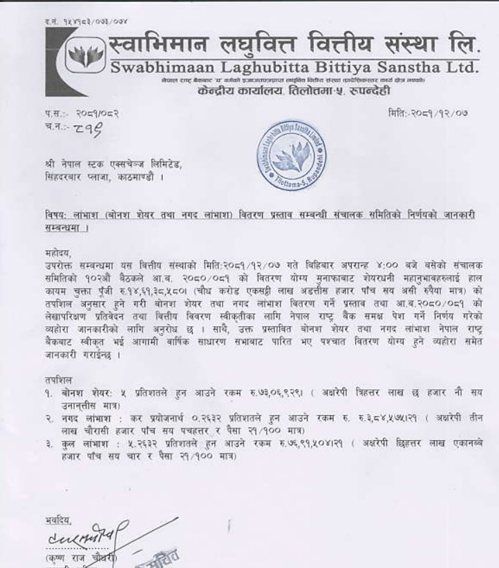 स्वाभिमान लघुवित्त वित्तीय संस्था लिमिटेले गत आर्थिक वर्षको मुनाफाबाट शेयरधनीहरुलाई वितरण गर्ने लाभांश घोषणा गरेको छ।