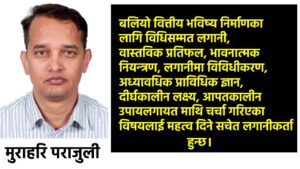 बलियो वित्तीय भविष्य निर्माणका लागि विधिसम्मत लगानी, वास्तविक प्रतिफल, भावनात्मक नियन्त्रण, लगानीमा विविधीकरण, अध्यावधिक प्राविधिक ज्ञान, दीर्घकालीन लक्ष्य, आपतकालीन उपायलगायत माथि चर्चा गरिएका विषयलाई महत्व दिने सचेत लगानीकर्ता हुन्छ।