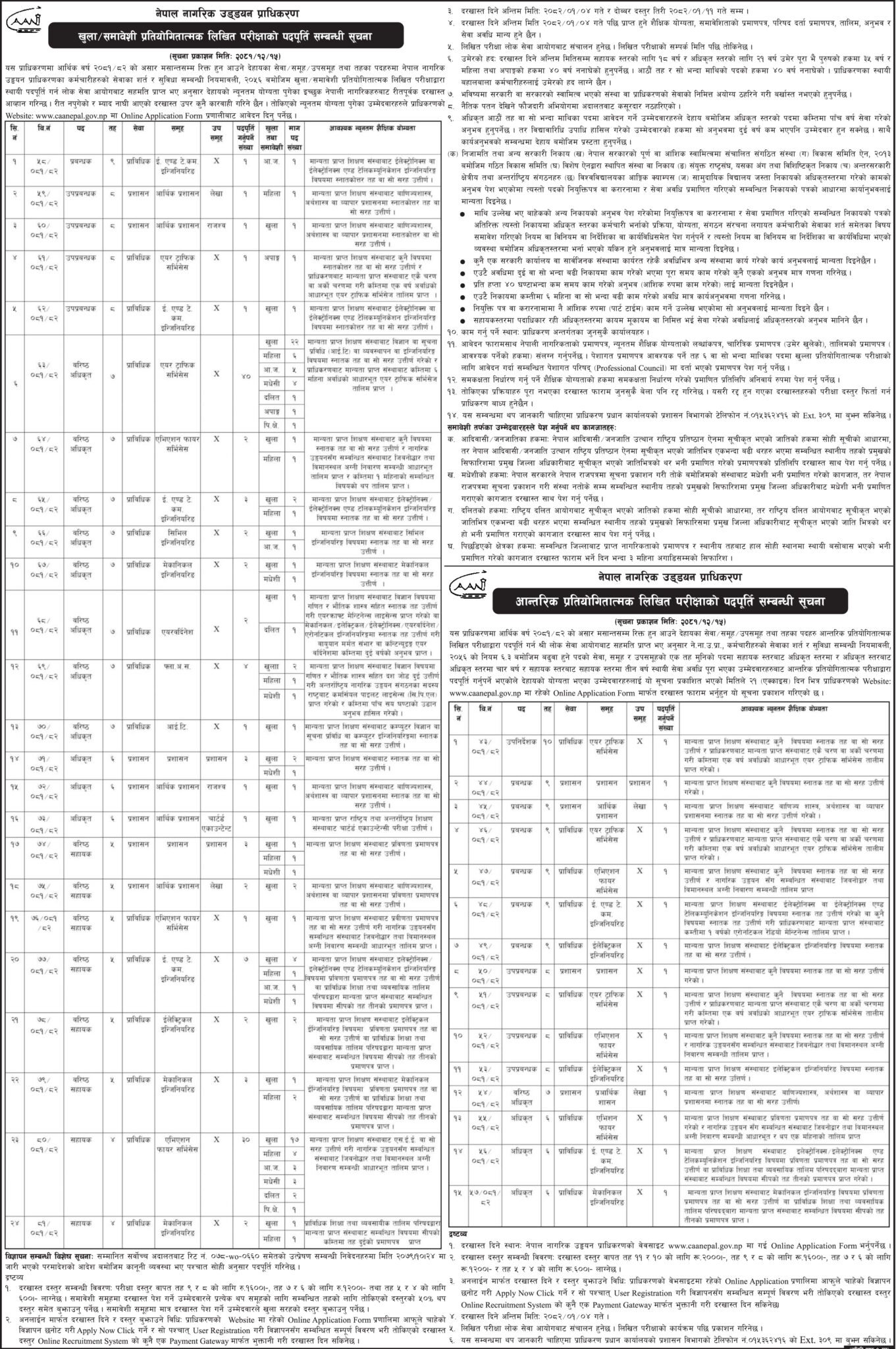 नेपाल नागरिक उड्ययन प्राधिकरणले विभिन्न पदहरूमा ११६ जना कर्मचारी माग गरेको छ।