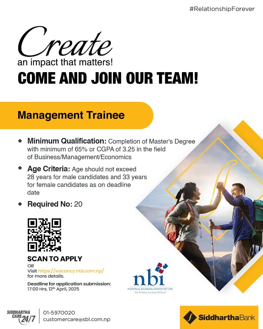 बैंकका अनुसार, उक्त पदका लागि आवेदन दिन इच्छुक उम्मेदवारले कम्तीमा स्नाकोत्तर तहमा ६५ प्रतिशत नतिजा ल्याएर उत्तीर्ण गर्नुपर्ने छ। सिद्धार्थ बैंकले महिलाका लागि २८ वर्ष र पुरुषका लागि ३३ वर्ष उमेर सीमित राखेको छ।