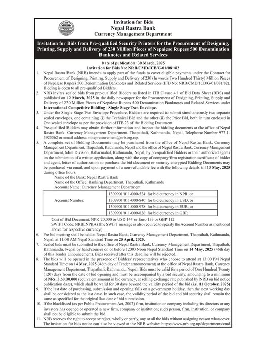 नयाँ नोट छाप्न इच्छुक आपूर्तिकर्ताहरूलाई गोप्य शिलबन्दी बोलपत्र पेस गर्नका लागि आह्वान गरिएको छ। इच्छुक आपूर्तिकर्ताले आगामी मे ३ तारिखसम्म बोलपत्र पेस गर्न सक्नेछन्। बोलपत्र पेस गर्ने क्रममा २० हजार रुपैयाँ अथवा १४४ अमेरिकी डलर, १३३ युरो वा ११२ पाउन्ट स्टेर्लिङको शुल्क लाग्ने छ।