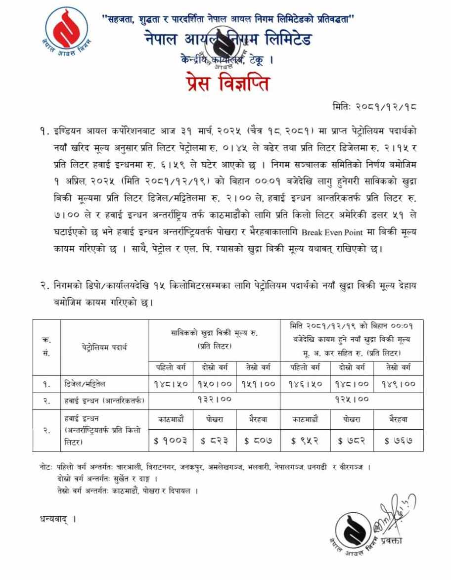 आयल निगमनका अनुसार डिजेल र मट्टितेलमा प्रति लिटर २ रुपैयाँ तथा हवाइ इन्धन आन्तरिकतर्फ प्रति लिटर ७ रुपैयाँले घटेको छ।