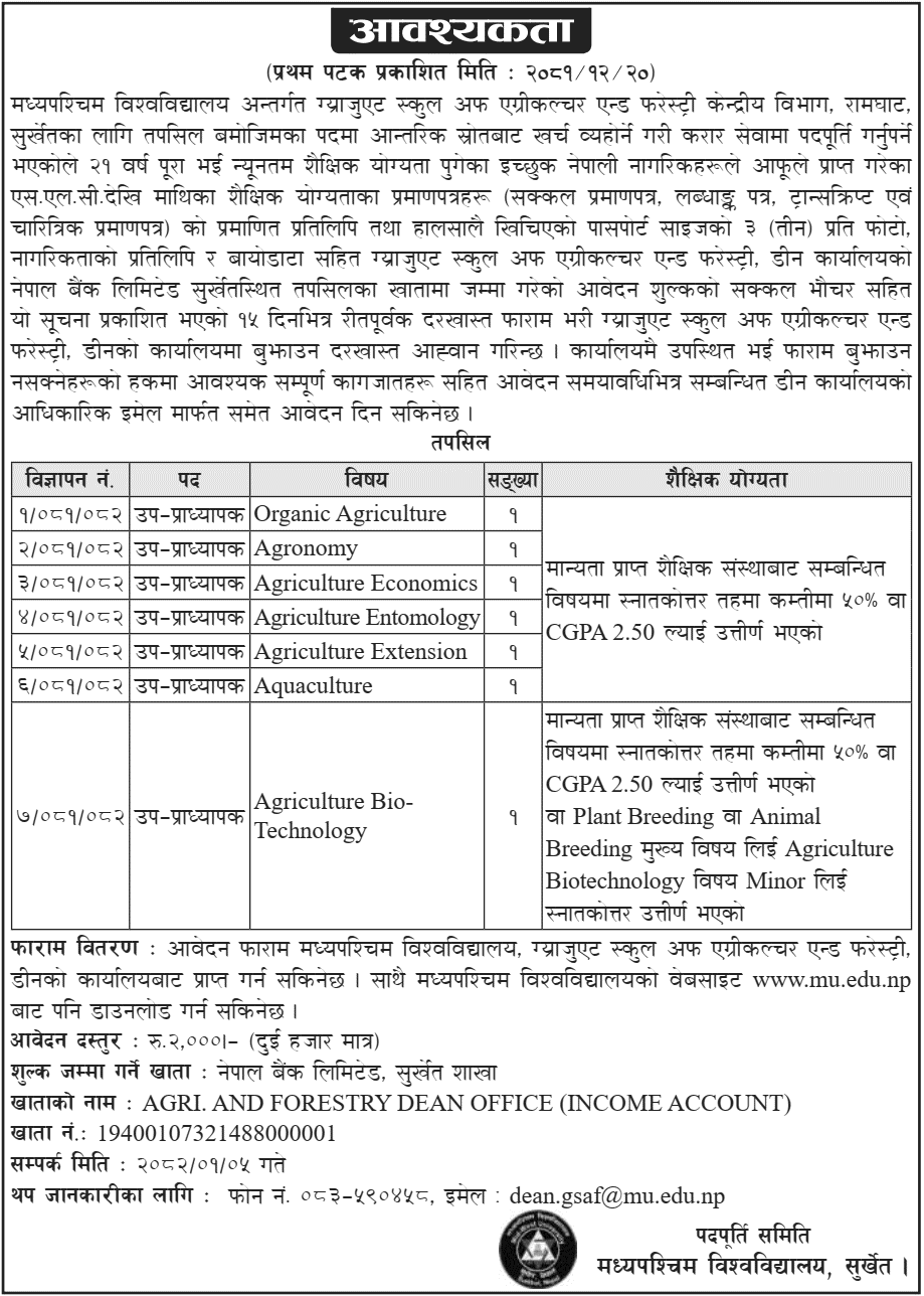 विश्वविद्यालयको ग्र्याजुएट स्कूल अफ एग्रिकल्चर एण्ड फरेष्टी, केन्द्रीय विभाग सुर्खेतमा ७ जना उप९प्राध्यापक पदका लागि आवेदन आह्वान गरिएको हो।