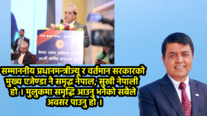 सम्माननीय प्रधानमन्त्रीज्यू र वर्तमान सरकारको मुख्य एजेण्डा नै समृद्ध नेपाल, सुखी नेपाली हो । मुलुकमा समृद्धि आउनु भनेको सबैले अवसर पाउनु हो । त्यसका लागि पैसा, वुद्धि, विवेक र सीपको लगानी गर्नुपर्यो । त्यो भन्दा पनि पहिले पैसाको लगानी हुनु आवश्यक छ । जसले पछि उत्पादन गर्दा श्रम र सीपको माग गर्नेछ ।