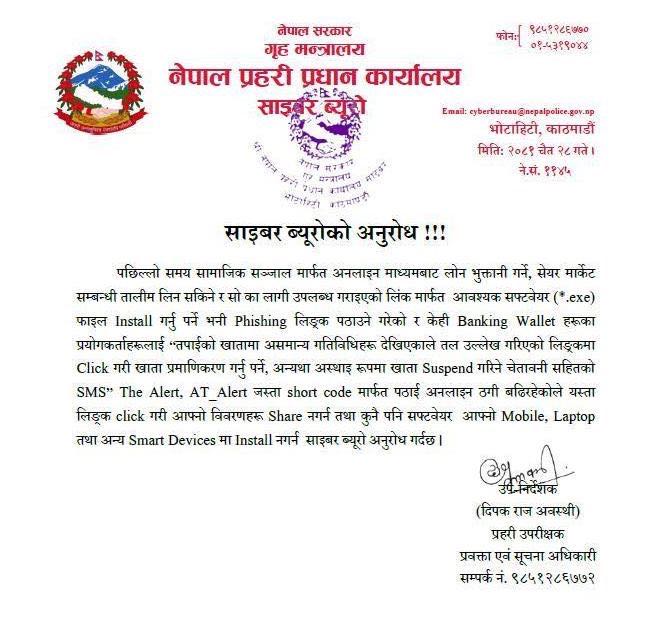 ब्यूरोले एक सूचना जारी गर्दै सामाजिक सञ्जाल तथा म्यासेजमा पठाइएका लिंक क्लिक गरी आफ्ना विवरण सेयर नगर्न र कुनै पनि सफ्टवेयर आफ्नो मोबाइल, ल्यापटपलगायत उपकरणमा ‘इन्स्टल’ नगर्न सूचित गरेको हो।