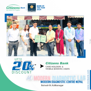 सिटिजन्स बैंक इन्टरनेसनल लिमिटेड र बुटवल स्थित मोर्डन डायग्नोस्टिक सेन्टर नेपालबीच सिटिजन्स बैंकका ग्राहकहरूलाई विशेष छुट दिने समझदारी पत्रमा हस्ताक्षर भएको छ ।