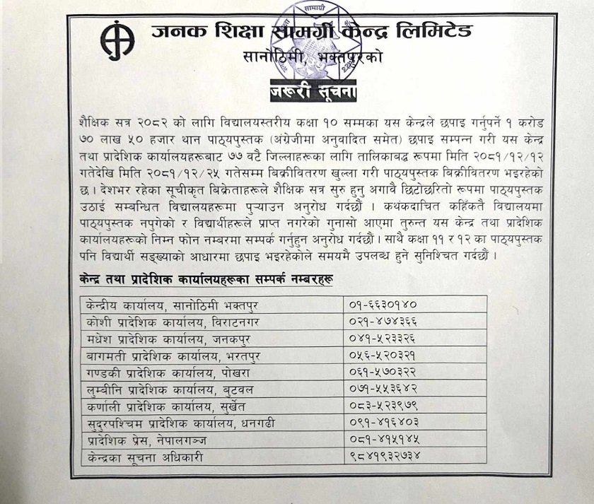 कुनै बिक्री केन्द्रमा पाठ्यपुस्तक नपुगेको भएमा केन्द्रका तपसिल बमोजिमका वितरण केन्द्रहरू वा सम्बन्धित स्थानीय तहको शिक्षा शाखा वा सम्बन्धित जिल्लाको शिक्षा विकास तथा समन्वय इकाईमा सम्पर्क गर्न अनुरोध गरेको छ ।