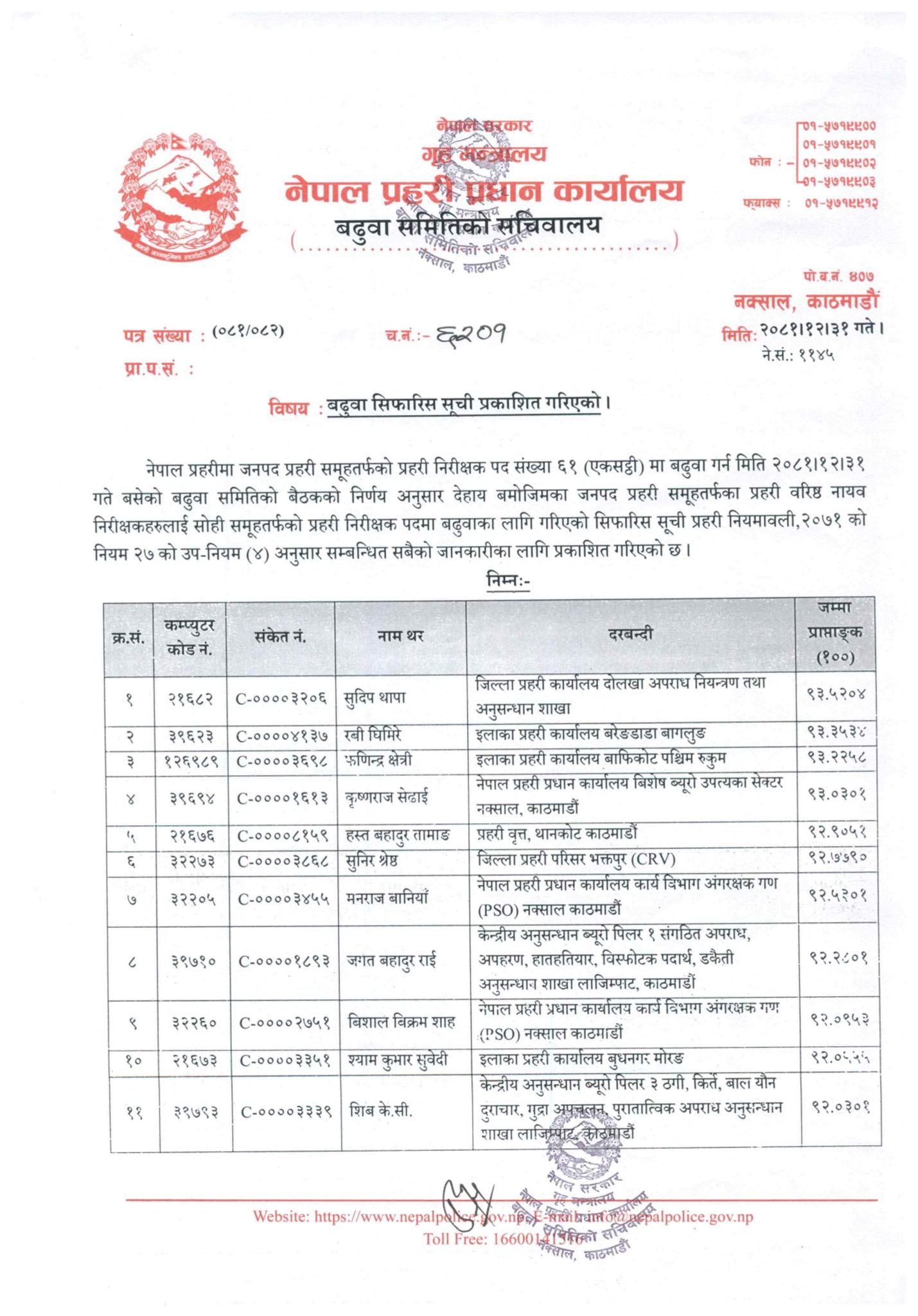 २०८१ साल चैत ३१ गते बसेको बढुवा समितिको बैठक अनुसार यो निर्णय गरिएको हो । प्रहरी वरिष्ठ नायब निरीक्षकहरूलाई सोही समूहतर्फको प्रहरी निरीक्षक पदमा बढुवाका लाग गरिएको सिफारिस सूची प्रहरी नियमावली २०७१ को नियम २७ को उपनियम ९४० अनुसार गरिएको जानकारी दिइएको छ ।