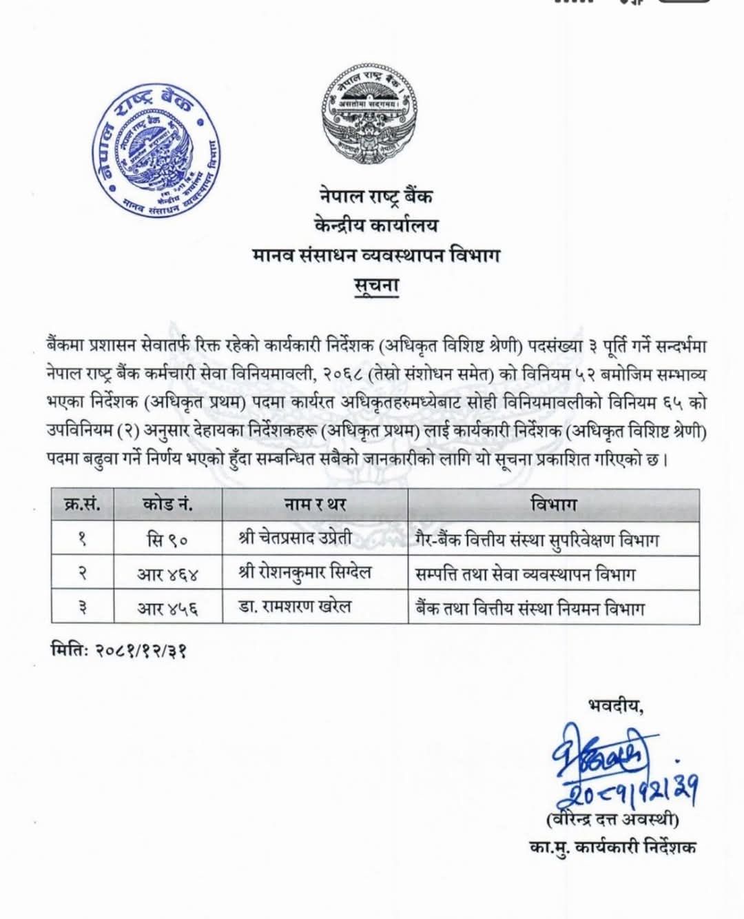 निर्देशक चेत प्रसाद उप्रेती, रोशन कुमार सिग्देल र डा. रामशरण खरेललाई कार्यकारी निर्देशकमा बढुवा गरेको हो । उप्रेती हाल गैर बैंक वित्तीय संस्था सुपरीवेक्षण, सिग्देल सम्पत्ति तथा सेवा व्यवस्थापन विभाग र डा. खरेल बैंक तथा वित्तीय संस्था नियमन विभागमा छन् ।